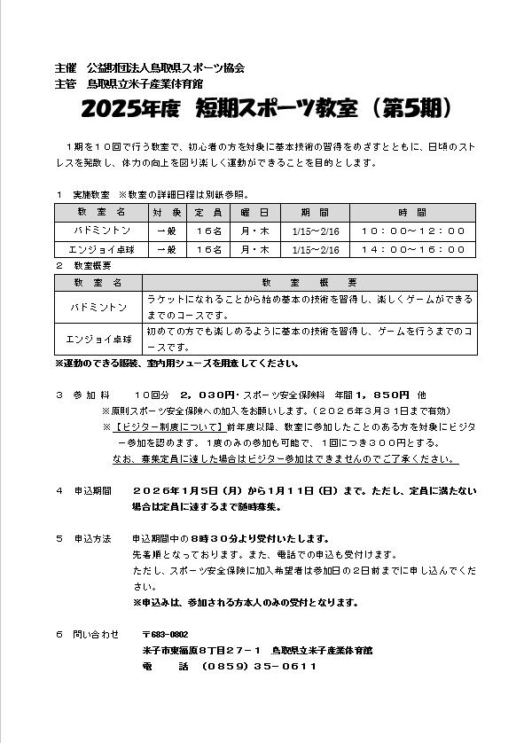 2025年12月16日 第5期短期教室のお知らせ バドミントン、卓球教室の募集を2026年1月5日(月)から1月11日(日)まで。ただし、定員に満たない場合は定員に達するまで随時募集します。※第5期エンジョイ卓球教室のみ1月11(日)時点で定員を超えた場合、抽選とさせていただきます。 (12月25日 17時16分現在)