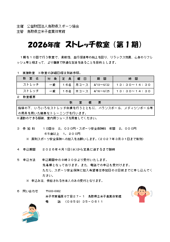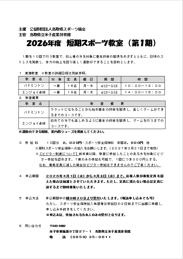 2026年3月21日 2026年度第1期短期教室のお知らせ バドミントン、卓球教室の申込期間を4月1日(水)から4月8日(水)まで募集します。※ 定員に満たない場合は定員に達するまで随時募集いたします。※ 第1期エンジョイ卓球教室のみ4月8日(水)時点で定員を超えた場合、抽選とさせていただきます。 ストレッチ教室の申込期間を4月1日(水)から定員に達するまで随時募集いたします。 (3月21日 19時57分現在)