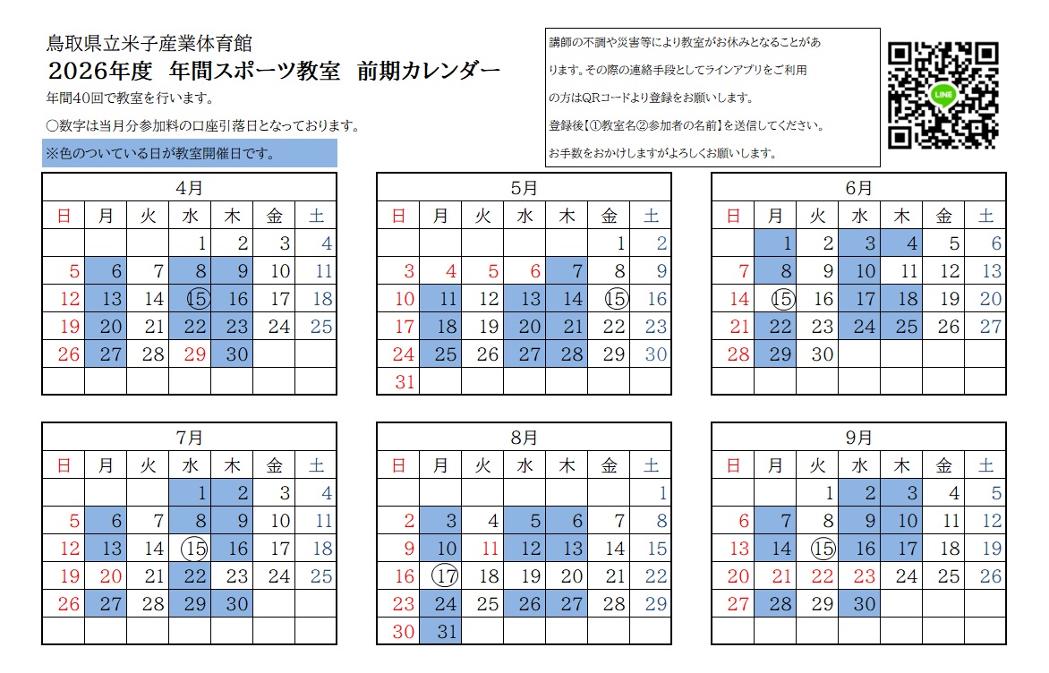 - 随時受け付けております。直接、米子産業体育館の事務室に申込みください。